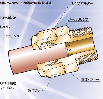 Easy-to-connect copper pipe fittings Naslock OS ข้อต่อท่อทองแดง Naslock OS คุณสมบัติ - ใช้ แหวนล็อคแบบยืดหยุ่น ข้อต่อแบบใช้ซ้ำได้ ซึ่งให้กำลังการล็อคที่มั่นคงแม้จะใช้งานซ้ำแล้วซ้ำอีก - ติดตั้งและถอดง่าย เพียง ขันน็อตให้ชิดกับตัวข้อต่อ เท่านี้ก็เสร็จเรียบร้อย หากต้องการถอดออก ให้คลายน็อตเล็กน้อย - การปิดผนึกที่มั่นคง กลไกการปิดผนึกด้วยท่อใช้โอริง เพื่อป้องกันไม่ให้ชิ้นส่วนซีลได้รับความเสียหายจากเสี้ยนหรือรอยขีดข่วนบนพื้นผิวที่ถูกตัดเมื่อใส่ท่อ โอริงจะกว้างกว่าเส้นผ่านศูนย์กลางภายนอกของท่อเมื่อใส่เข้าไป และ มี "โครงสร้างการซีลตัวเอง" ที่ซีลด้านนอก เส้นรอบวง ของท่อพร้อมกับขันน็อตให้แน่น - ใส่ท่อที่สามารถขันให้แน่นได้ชั่วคราว และขันน็อตเล็กน้อยด้วยมือ แหวนล็อคลดเส้นผ่านศูนย์กลาง จะกัดเข้าที่เส้นรอบวงด้านนอกของท่อ ทำให้ง่ายต่อการปรับตำแหน่งของท่อ - สามารถถอดออกเป็นท่อดิบได้ เมื่อถอดออก เพียงขันน็อตให้แน่นแล้วท่อก็สามารถถอดออกได้เป็นท่อดิบโดยไม่ต้องมีตัวล็อคติดอยู่กับท่อ ทำให้การซ่อมแซมและเปลี่ยนใหม่ทำได้ง่าย