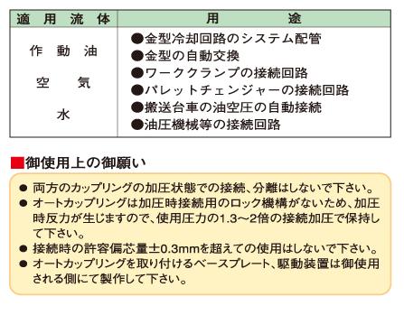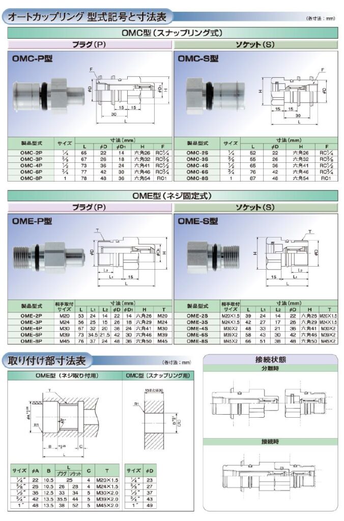 Auto coupler คัปเปิลอัตโนมัติ คุณสมบัติ - ทั้งซ็อกเก็ตและปลั๊กของคัปเปิลอัตโนมัติมีวาล์วเปิดและปิดอัตโนมัติ ดังนั้นของเหลวจะไม่รั่วไหลเมื่อถอดออก - ข้อต่ออัตโนมัตินี้ได้รับการออกแบบมาโดยเฉพาะสำหรับการเชื่อมต่อและตัดการเชื่อมต่ออัตโนมัติ และสามารถเชื่อมต่อและตัดการเชื่อมต่อท่อหลายท่อพร้อมกันได้โดยใช้กระบอกสูบขับเคลื่อนด้วยน้ำมันและอากาศ - มีวิธีการติดตั้งสองวิธี: การติดบนแผ่นและการยึดด้วยสกรู - มาพร้อมฟังก์ชันลอยตัว (โอริง) ที่ช่วยให้หาจุดศูนย์กลางในการใส่และติดตั้งได้ง่าย (เฉพาะประเภท OMC) - สามารถเชื่อมต่อของเหลวและวงจรต่างๆ เข้ากับแผ่นเดียวกันได้ จึงสามารถเชื่อมต่อของเหลวและวงจรต่างๆ ได้ในเวลาเดียวกัน - เรายังผลิตข้อต่ออัตโนมัติแบบต่อและตัดการเชื่อมต่อแบบไม่รั่วตามสั่ง ซึ่งจะไม่รั่วซึมของเหลวปริมาณเล็กน้อยเมื่อตัดการเชื่อมต่อ