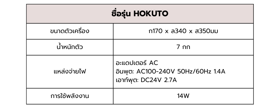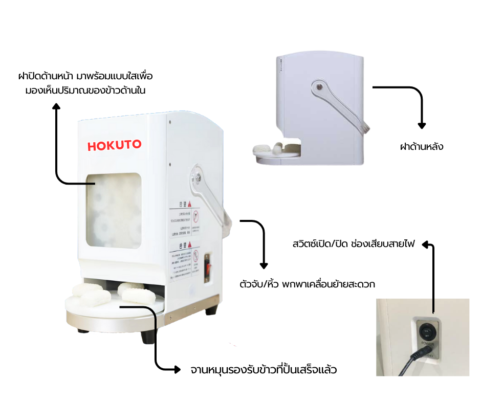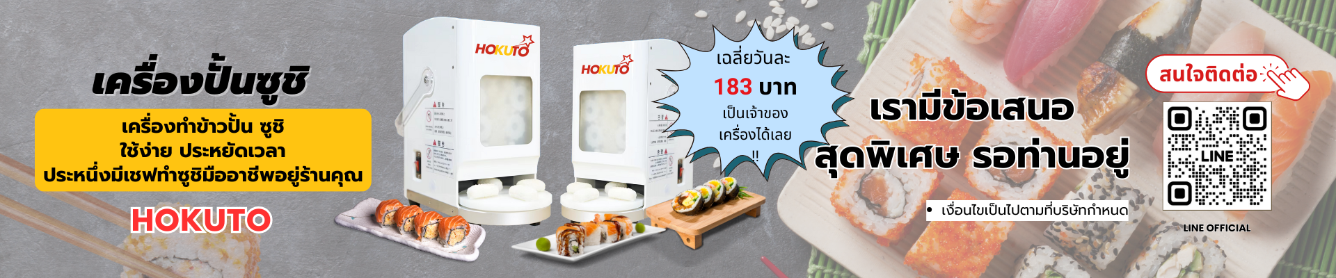 เครื่องทำข้าวปั้น ซูชิ ใช้ง่าย ประหยัดเวลา ประหนึ่งมีเชฟทำซูชิมืออาชีพอยู่ร้านคุณ คุณสมบัติ ทำซูชิ คุณภาพสูงได้ง่ายๆ น้ำหนักและขนาดคงที่ ดูสวยงาม ไม่มีความแตกต่างด้านคุณภาพระหว่างคนผลิต ไม่ต้องมีประสบการณ์ในการผลิต และไม่ต้องผ่านการฝึกอบรม ก็ทำได้ ชั่วโมงการทำงานสั้น และค่าแรงต่ำ ไม่ต้องเป็นห่วงเรื่องพนักงานพักผ่อนหรือลาออก ความเร็วในการผลิต 20ชิ้น/นาที (1200/ชั่วโมง) น้ำหนักเบา ทนทาน ทำความสะอาดง่าย ขนาดของข้าวปั้นที่เหมาะสม ขนาดชิ้น 16/18g ร้านซูชิสายพานลำเลียงที่คุณอยากทานซูชิเยอะๆ ร้านอาหารญี่ปุ่นที่คุณอยากลองอาหารอื่นๆ ที่ไม่ใช่ซูชิสำหรับร้านอาหารที่หน้าซูชิมีขนาดเล็กลง ปริมาณกรัมน้อยกว่าก็เหมาะสมเพื่อไม่ให้อิ่มเร็วเกินไป ขนาดชิ้น 20/22/24g สำหรับซูชิบรรจุกล่องจากซุปเปอร์มาร์เก็ตและร้านซื้อกลับบ้าน ขนาดกรัมที่ใหญ่ขึ้นจะให้ความรู้สึกอิ่มพอดี ขนาดชิ้น 22/24g สำหรับร้านอาหารที่ทานได้ไม่อั้น ขนาดกรัมที่ใหญ่ขึ้นก็เหมาะสมเพื่อให้แน่ใจว่าคุณอิ่มท้อง มีแม่พิมพ์ (โมล์) ให้เลือกหลากหลาย จำนวน กรัม ขนาดสำเร็จรูป การใช้งาน กำลังการ ผลิต/ชม. 16g W24xD53xH20mm สำหรับซูชิ 1200ชิ้น 18g W25xD53xH21mm สำหรับซูชิ 1200ชิ้น 20g W26xD53xH22mm สำหรับซูชิ 1200ชิ้น 22g W27xD53xH23mm สำหรับซูชิ 1200ชิ้น 24g W29xD53xH23mm สำหรับซูชิ 1200ชิ้น ความแตกต่างระหว่างคนกับเครื่องปั้นซูชิ พนักงานปั้นซูชิ ยากที่จะปั้นให้มีคุณภาพเหมือนกัน น้ำหนักข้าวซูชิไม่คงที่ รูปทรงไม่คงที่ ไม่มั่นใจความสะอาดเพราะการปั้นจากมือ ต้องการระยะฝึกฝนยาวนาน มีปัญหาเรื่องกฎหมายแรงงาน มีการหยุด พัก ลา มีปัญหาเรื่องสุขอนามัย เฉพาะบุคคล มีอารมณ์และความรู้สึกที่ยากจะควบคุม ต้องมีการปรับเงินเดือนตลอดระยะทำงาน เวลาเฉลี่ยในการปั้น 15 วินาที/ชิ้น เครื่องปั้นซูชิ HOKUTO คุณภาพเท่ากันทุกลูก น้ำหนักข้าวซูชิคงที่ รูปทรงคงที่ วัสดุ FOOD GRADE ปลอดภัย ประกอบเครื่อง กดปุ่มเปิด ก็เริ่มงานได้เลย ไม่มีปัญหาเรื่องกฎหมายแรงงาน ทำงานได้ตลอดทั้งวัน ถอดล้างง่าย สะอาด ตามมาตรฐานสากล ทำงานอย่างต่อเนื่องตามหน้าที่ กินค่าไฟ 14w เท่าหลอดไฟ 1 หลอด เวลาเฉลี่ยในการปั้น 3 วินาที/ชิ้น ข้อเสนอในการเช่าซื้อ/ซื้อขาด เครื่องปั้น ซูชิ ข้อเสนอในการเช่าซื้อ/ซื้อขาด เครื่องปั้น ซูชิ 1. เช่าซื้อ - เครื่องใหม่ (รายเดือน) 2. ซื้อขาด - เครื่องใหม่ ค่าเช่า 5,500 บ./เดือน(+Vat 7%) มัดจำ 3 เดือน + ค่าเช่าล่วงหน้า 1 เดือน ซื้อเงินสด 85,000 บาท(+Vat 7%) (ราคาปกติ 88,000 บาท) (+Vat 7%) สิทธิพิเศษที่จะได้รับ ฟรี! ให้คำปรึกษาเรื่องการดูแลเครื่อง (ผ่านLINE@) ตลอดระยะเวลาการเช่า (ไม่รวมอะไหล่เสื่อมเสีย) ลูกค้าสามารถเปลี่ย
